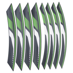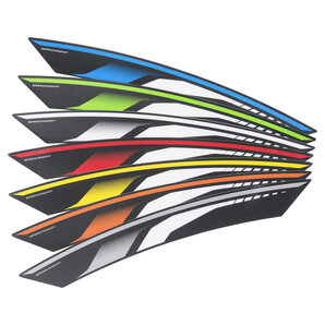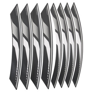 Disponibili nelle larghezze 34 a 54 mm, questi adesivi sono forniti su pellicola suddivisi in segmenti da 1/4 di cerchio, per seguire esattamente la curvatura della ruota anteriore e posteriore.
